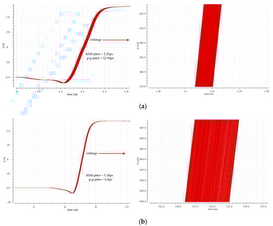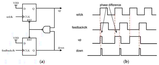 For the purpose of avoiding the above problems of the traditional structure, a phase detector with a completely symmetrical structure is used [22], as shown in Figure 6a. It can function well in [−, ] with no dead zone and the effective electrical level of the output signal is low-level. In the beginning, refclk and feedbackclk are both considered low-level. At this time, transistors M1–M4 are turned on, M7, M8 are turned off, nodes UP and DOWN are charged to a high-level, and then M5, M6 are turned off, and M9, M10 are turned on. If refclk turns to high before feedbackclk, M2 and M4 are turned off to stop charging, and M8 is turned on. Because M10 has been turned on in advance, the node DOWN will quickly discharge to a low level along the path of M8 and M10. After node DOWN becomes low, turn off M9 and turn on M5. Node UP is stuck at high-level, and our effective low-level signal DOWN is output. After refclk and feedbackclk both become low, the signals UP and DOWN both change back to the initial high-level, which is the initialization for the next comparison. Similarly, if feedbackclk turns to high before refclk, the circuit will output an effective low-level signal UP. As we can see in Figure 6b, the pulse width of the output signals is stretched to at least half of the reference clock cycle regardless of how small the phase difference is. It is worth noting that the conversion time of the signal is not negligible. If the subsequent circuit sampling UP and DOWN signals activate the rising edge of the reference clock named refclk, an incorrect value may be sampled. In response to this situation, a buffer is inserted in the clock path to ensure that the register can sample the expected value.