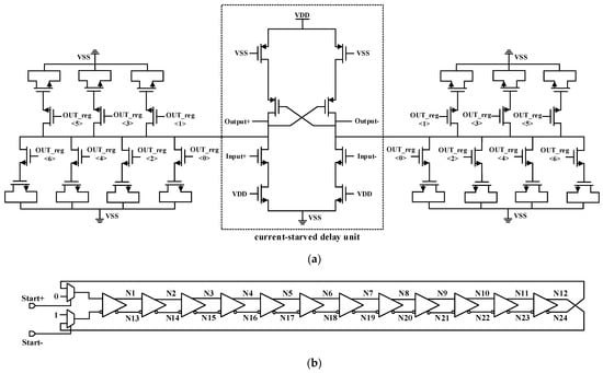 To employ our delay line in multi-channel TDC, a digitally controlled delay element with controllable capacitance is proposed and the structure is shown in Figure 7a. The main part is a symmetrical current-starved delay unit which is able to keep the delay resolution of rising edge and falling edge as consistent as possible. In order to achieve high resolution and wide measurement range at the same time, the delay line of the Vernier TDC is generally connected as a ring [23,24]. Catering for the requirement mentioned, the input and output ports of our delay unit are differential, which can be connected into a circular delay line, as shown in Figure 7b. It is obvious that only 12 delay units can generate 24 phases, which can significantly reduce the area of multi-channel TDC. The digital signal OUT_reg<6:0> is used as the control bit for the delay element to adjust the state of switching transistors. The state of the switching transistor can affect the size of load capacitance, thereby affecting the delay time of the delay unit. In the proposed delay element, the delay resolution of a single delay unit is 0.71 ps in the 25 °C TT process, and the delay range of a delay unit is 84.3 ps to 174.5 ps. The entire delay line contains 12 delay units, hence the delay resolution of the entire delay line is 8.52 ps.