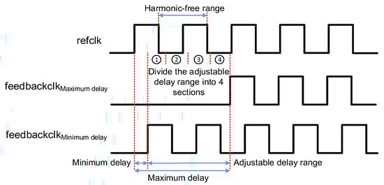 Usually, conventional ADDLL adopts a counter to adjust the delay line [14]. To take into account the wide frequency range together with the small delay resolution, the locking time of counter-based DLL will increase exponentially as the control bits increase. Therefore, a successive approximation register-controlled (SAR) circuit is employed to reduce the locking time [15], but as it is affected by its open-loop characteristic, additional calibration circuits should be taken into consideration to track the PVT variations, which not only increase the complexity of the whole DLL but also raise the power consumption. Then a variable successive approximation register-controlled (VSAR) algorithm is adopted to keep tracking the PVT variations after first locking [16,17]. The method transforms the VSAR circuits into a counter after the first locking, the counter adjusts the delay according to the changes in the external environment. On account of the finite step size of adjustment, the delay of the digitally controlled delay line (DCDL) may not be exactly equal to the clock period, even if the DLL is considered locked. So, the digital codes for a counter-based DLL will change back and forth around the edge of the reference clock which we called the dithering phenomenon [18]. The dithering phenomenon increases both the total power dissipation and output uncertainty. In order to solve the dithering phenomenon, a tri-state digital phase detector (TSDPD) which has an additional Hold region is used in [16,19]. Once the comparison result between the two signals in TSDPD falls into the HOLD region, the circuit is locked, and the dithering phenomenon is suppressed. However, we need to accurately control the range of the HOLD region which has to be slightly larger than the delay step. The drawback of this method is that the range of the HOLD region will change due to PVT variations, and it is hard to apply TSDPD to other DLLs which differs in delay step. Moreover, because the relationship between the initial delay time and the reference clock is unknown, harmonic locking issues may occur in the wide-operating frequency range DLL, which means the delay provided by DLL is a 720° phase or more instead of 360°, resulting in false locking. The widely used SAR DLL has the problem of harmonic locking. To deal with the harmonic locking issue, a SAR DLL is presented in [20] with a resettable linear lattice delay line (LDL). It has to work with the proposed LDL which limits its scope of application. A starting-bit prediction (SBP) algorithm is presented in [21] which can avoid harmonic locking issues effectively, but the design of the associated circuit is complex and resource-consuming. Furthermore, the maximum operating frequency under the SBP algorithm is limited by the intrinsic delay of the delay line, Tintrinsic ≤ Tclk/2.