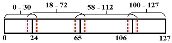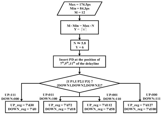 where denotes rounding up the rational number to an integer, thus Y means the first position where we can insert PD. Min and Max denote the minimum delay and maximum delay of a single delay unit, respectively. M represents the number of delay units in the entire delay line and N represents the position of the minimum lockable clock period in the delay line which has a maximum delay. Position N to position M represents the adjustable range of our delay, the same as the 7-bit control code varies from 7′d0 to 7′d127. After dividing the adjustable delay range into four segments as evenly as possible, and then according to the output of the three PDs, we can adjust the delay to one of them, corresponding diagram, as shown in Figure 8. Then we start the binary search in the selected segment. Take the proposed ADDLL as an example, the detailed coarse locking process is as shown in Figure 9, and the delay value used is obtained in the 25 °C TT process.