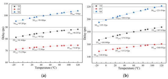 Taking temperature variations and different processes into consideration, the segmentation method of coarse lock can still be applied. When the control code OUT_DLL<6:0> is 7’b0000000 and 7’b1111111, respectively, the delay variations of a single delay unit are recorded with post-layout simulation, as shown in Figure 11. We supposed that temperature and process will not change at the same time. After the calculation of all cases, we found that the maximum value of N was 5.854 which was obtained in case TTmin, and the corresponding segmentation result was: 0–23, 23–65, 65–107, 107–127. The minimum value of N was 5.58 which was obtained in case FFmax, the corresponding segmentation result was: 0–28, 28–68, 68–108, 108–127. It is obvious that both of the worst-case scenarios were covered by our extended segmentation which was: 0–30, 18–72, 58–112, 100–127. This means that the proposed coarse locking method is correct at different processes and temperatures.