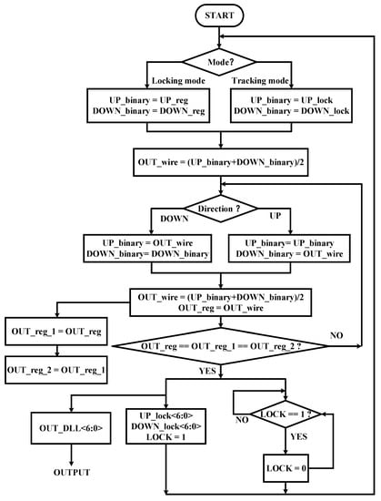 After coarse locking, we need to find the exact control code for the delay line. A conventional binary search can quickly converge to the target value, but it has an open-loop characteristic which makes it unable to adjust the delay according to the changes in PVT. The flow chart of the proposed modified binary search algorithm is shown in Figure 12. It works with two modes: locking mode and tracking mode. A different initial value is assigned to the binary search module to start the searching process in a different mode. In locking mode, first, the segment of target delay is selected by coarse locking, after that, UP_reg<6:0> and DOWN_reg<6:0> of the chosen segment to the binary search module as the initial value is assigned. Then judge whether it has been locked through the lock module; once locked, it will output a high-level signal named LOCK which is maintained for one clock cycle. The signal LOCK is used to determine the working mode. If LOCK goes too high, the circuit goes into tracking mode. Then by assigning UP_lock<6:0> and DOWN_lock<6:0> to the binary search module as the initial value, UP_lock<6:0> and DOWN_lock<6:0> are output by the lock module. LOCK = 1 means that the search of the main delay line has reached a temporarily stable state, and at this time OUT_reg<6:0> is assigned to OUT_DLL<6:0>. Then use OUT_DLL<6:0> to control the delay of the replica delay line. After that, the main delay line performs a small range search near the output control code OUT_DLL<6:0>. The search range is between UP_lock<6:0> and DOWN_lock<6:0>. If the external environment does not change, the main delay line will be locked at the previous value again and output the same OUT_DLL<6:0>, otherwise, it will output a new OUT_DLL<6:0> according to the external changes. In tracking mode, the main delay line continues to perform a binary search in a small range according to the values of UP_lock<6:0> and DOWN_lock<6:0>; therefore, a closed loop is formed to track the variations of PVT. Moreover, during the tracking mode, the delay of the replica delay line will remain stable unless the external environment change, and we take the control code of the replica delay line as the final output of the DLL which means it can be applied to multiple delay lines without dithering.