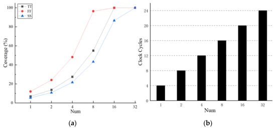 It can be seen from Figure 13a,b that the Coverage rate and the clock cycles required for locking both increase with the increase in the Num. When the value of Num is 16, almost 100% Coverage can be achieved under 3 different process corners, and the clock cycle required for locking is less than those numbers which can also achieve 100% Coverage because we checked whether “OUT_reg<6:0> = OUT_reg_1<6:0> = OUT_reg_2<6:0>” was satisfied to judge whether the DLL was temporarily locked. If we add and subtract the same value of Num to get the value of UP_lock<6:0> and DOWN_lock<6:0>, the output digital code OUT_reg<6:0> will be the same as the last one. Then the LOCK signal will go wrong which will influence the tracking process. Therefore, we added 17 and subtracted 15 to OUT_DLL<6:0> to get the value of UP_lock<6:0> and DOWN_lock<6:0>, respectively.