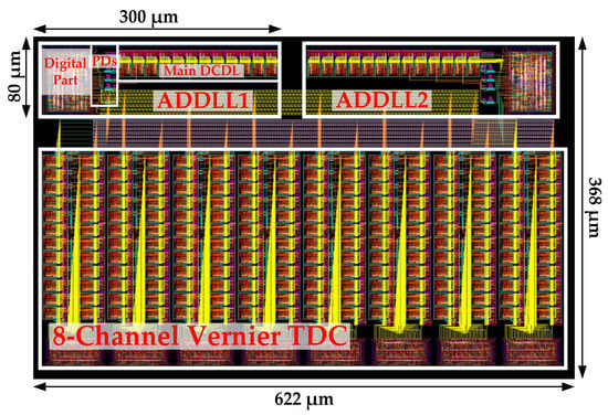 The proposed ADDLL was designed in 55 nm CMOS technology. The power supply voltage was 1.2 V. Figure 15 shows the layout of the proposed ADDLL and eight-channel Vernier TDC, where the active area of an ADDLL was about 0.024 mm2. Multi-channel TDC allowed us to collect more information at the same time, while Vernier architecture ensured high precision and high resolution for TDC. When the proposed ADDLL operated at 800 MHz, the power consumption was about 6.92 mW. The required reference clock cycles for locking were 29 to 37.