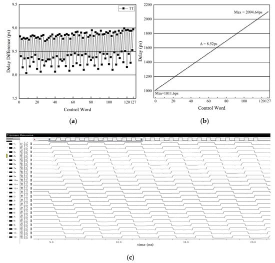 The post-layout simulation result showed the variation of the delay resolution in the 25 °C, TT process corner, as depicted in Figure 16a. It can be seen that when the 7-bit control code varied from 0 to 127, the delay resolution was always between 8 ps and 9 ps. The maximum value was 8.99 ps, and the minimum value was 8.04 ps. The delay resolution of the entire delay line was small and had good uniformity. Figure 16b describes the relationship between the delay time of the whole delay line and the 7-bit control code. The delay range of the entire delay line was from 1011.6 ps to 2094.64 ps, and the average step size was about 8.52 ps. It means that in the 25 °C, TT process corner, the operating frequency range was 480 MHz to 980 MHz. Taking into account variations in temperature and process, the operating frequency range of the proposed ADDLL was 560 MHz to 800 MHz. The 24 phases provided by the replica delay line to the Vernier TDC are shown in Figure 16c, and the simulation result was obtained at 600 MHz and showed good linearity.