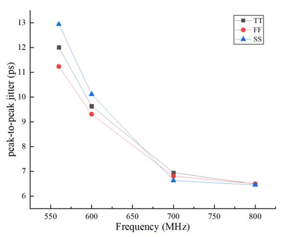 Figure 18 shows the variation of peak-to-peak jitter with respect to different processes at several frequencies. We know from the results that the p-p jitter was smaller at a higher frequency, this is because the delay unit turns on more transistors at lower frequencies, making the delay more sensitive to changes in the process. The smaller the frequency, the larger the p-p jitter interval between different processes.