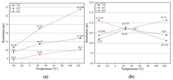 From the simulation results in Figure 20, it is obvious that the stability of TDC resolution was better when we used the delay line provided by the proposed ADDLL than when using the ordinary delay line. Especially under the condition of 25 °C and the TT process, the resolution of the Vernier TDC with the proposed ADDLL was very stable. This shows the good performance of ADDLL even if the PVT varies.