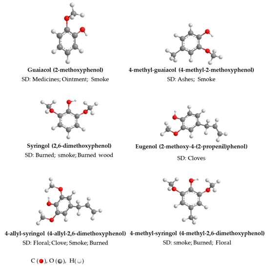 Figure 1 shows the chemical structures and sensory properties of the most frequent volatile phenols in AWS, examined in this study.