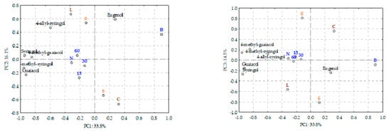 PCA representation of loadings and scores of all AWS samples and all volatile phenols analysed. Legend: C and L stand for the wood used in the ageing process, Chestnut and Limousin respectively; O15, 30 and 60 are the different micro-oxygenation modalities used in the alternative system; N—without micro-oxygenation; B—Barrel; 0—0 months in bottle; 6—6 months in bottle.