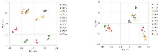 PCA was performed with spectral information of the AWS with chestnut (C) and with Limousin wood, acquired in NIR. Legend: C and L stand for the wood used in the ageing process, Chestnut and Limousin respectively; 15, 30 and 60 the different levels of micro-oxygenation used in the alternative system; N—no micro-oxygenation used in the alternative system; B—Barrel; 0—0 months in a bottle; 6—6 months in bottle.