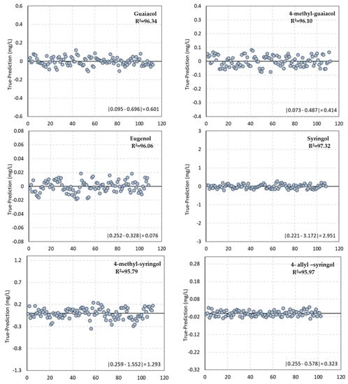 Regarding Table 3, all values of r2 are higher than 90.05%, which can be classified as excellent precision [52]. The values of r2 ranged between 90.05% for 4-allyl-syringol and 97.81 for syringol.