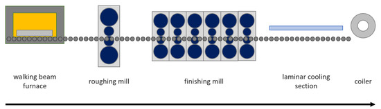 Figure 1 represents the most important elements of the hot rolling process. At first, a cold slab enters the walking beam furnace, where it is heated for several hours to reach the temperature of about 1200 C. After leaving the furnace slab it is transported by a conveyor belt to the roughing mill (RM). The RM consists of one pair of horizontal rolls and one pair of vertical rolls, which reduce the thickness and width of a slab. Every slab passes back and forth the RM many times, giving a total of five to nine passes. Before each pass, the slab is sprayed with pressurized water in a descaler to remove any scales from the surface of the steel. After the RM section, the transfer bar (which is the name of this intermediate product) is transported to the finishing mill (FM), which is the most complex section of the process. FM consists of six rolling stands in tandem that reduce the thickness of the steel to the desired value. As the rolling process progresses, the temperature of the material decreases to reach approximately 900 C at the last stand of the FM. After rolling, the steel is cooled to a predefined temperature in a laminar cooler, which uses water to lower the steel temperature. To produce high-quality steel process parameters (i.e., rolling force, looper tension, rolling speed), it must be precisely tuned and controlled to meet the product requirements. Except for the final dimensions, it is crucial to provide a product of desired mechanical (tensile strength, yield stress, elongation, grain orientation), visual (surface defects) and geometrical (flatness, wedge).