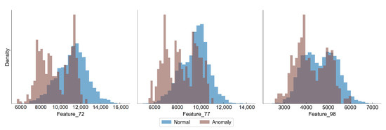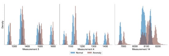 Figure 5 shows how the value of a selected feature changes with the number of cycles. The increase of the value from a baseline may be considered as a sign of the anomaly and deterioration process. Figure 6 shows the distribution of some selected variables for normal and abnormal observations.