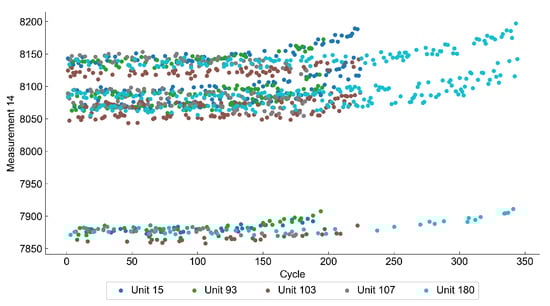 Plot of a single feature against cycle number of five randomly selected units in a C-MAPSS data set. The gradual deterioration of each unit is observed, starting at different cycles.