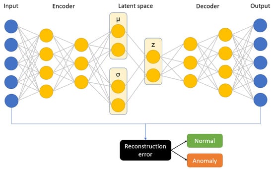 An Autoencoder (AE) [30] is one of many feed-forward neural network architectures. Autoencoders are gaining popularity recently in anomaly detection due to their flexibility. Their characteristic feature is having encoding layers followed by decoding multilayer neural network architecture connected through a latent multidimensional space (see Figure 8). During the iterative optimization (learning) process, the input is transferred to its output. The network tries to minimize the reconstruction error that propagates through the network. In this specific architecture, it is assumed that the latent space consists of a lower number of dimensions than the input data, which is also referred to as a bottleneck of the network. Therefore, we are dealing with the compression of the information followed by the decompression scheme. This can be very useful in terms of anomaly detection, because it can be assumed that we are only able to reconstruct properly the inputs similar to the ones that the network was trained on.