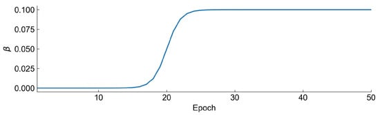 In the training process of the autoencoder, we have set two additional hyperparameters that were optimized—this is the number of epochs and batch size. To ensure low reconstruction loss of variational autoencoder, we have decided to use a annealing technique in our study. We always start with and start to increase it at some epoch to a value like a sigmoid function. The value of beta at each epoch is defined as: