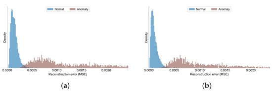 In the validation set, we have collected 10,242 observations, out of which 1575 were marked as anomalies. The confusion matrices in Table 3 show the detailed predictions of AE and VAE models. Table 4 presents a summary of the different metrics obtained by autoencoder and variational autoencoder. Although both models obtain very good metrics, the variational autoencoder slightly outperforms the simple autoencoder. In Figure 11 we have shown how the reconstruction errors of normal observations differ from the anomalous observations. Although there is some small overlapping between the distributions of the errors in each class, the anomalies tend to have much higher reconstruction errors compared to normal samples.