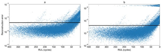 To observe how the reconstruction error behaves as the remaining useful life decreases, we have plotted the reconstruction error as a function of RUL for both studied models in Figure 12. Visual inspection of both plots shows very high similarity between them. However, the variational autoencoder for some observations computes an extremely high reconstruction error compared to other values. The figure shows that the first signs of degradation process may be observed when there are between 50 and 90 cycles left until failure.
