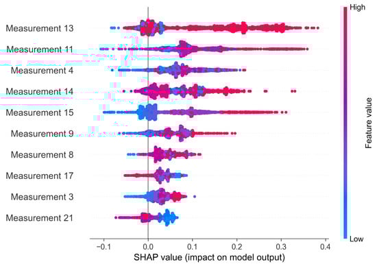 Usage of the SHAP method (in the same way as described in C-MAPSS data set) brings valuable information towards understanding the source of anomalies. In Figure 17 we can see that Feature No. 51 has definitely the greatest impact on the classification task. The general trend is that the values of the features decrease with the roll wear. However, what we must point out is that the surrogate model did not perform very well, as its F1 score was equal to 85%, which means that not all anomalies were properly assigned.