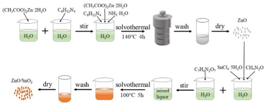 Preparation process of ZnO, SnO2, and ZnO/SnO2 composites.