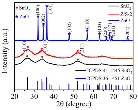 Figure 3 shows the XRD patterns of SnO2, ZnO, and the Z/S-2 composite material; these patterns were used to analyze the crystallinity and phase structure of each of the samples. The patterns show that there were diffraction peaks distributed between 20° and 80°. The SnO2 2θ diffraction peaks at 26.61°, 33.89°, and 51.78°, respectively, correspond to the lattice planes (110), (101), and (211), which are consistent with the tetragonal rutile structure of SnO2 (JCPDS card no. 41-1445) [25]. The ZnO 2θ diffraction peaks at 31.77°, 34.42°, 36.25°, 47.54°, 56.60°, 62.86°, 66.38°, 67.96°, 69.10°, and 76.95° respectively correspond to the (100), (002), (101), (102), (110), (103), (200), (112), (201), and (202) lattice planes, which is indicative of the hexagonal wurtzite ZnO structure (JCPDS card no. 36-1451) [26]. The diffraction peaks for the Z/S-2 composite material were the same as those for SnO2, but the characteristic diffraction peak of ZnO was not detected; this may be because of the lower content of ZnO in the composite.