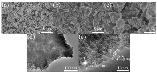 SEM spectra of (a) SnO2, (b) ZnO, and (c) Z/S-2 composite, and (d,e) TEM spectra of Z/S-2 composite.