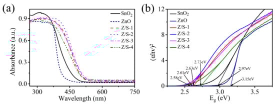 (a) UV-vis absorption spectra and (b) band gap energies of SnO2, ZnO, Z/S-1, Z/S-2, Z/S-3, and Z/S-4 composites.