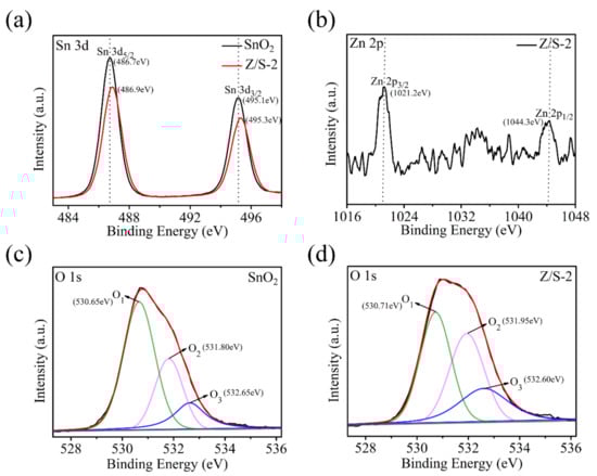 The elemental chemical states and compositions of the SnO2 and Z/S-2 composite materials were measured using XPS; the results are shown in Figure 6. The Sn 3d peaks for the SnO2 and Z/S-2 composite material are shown in Figure 6a. The binding energies of the Sn 3d5/2 peak were 486.7 and 486.9 eV, respectively, and those of the Sn 3d3/2 peak were 495.1 and 495.3 eV, respectively. The difference between the binding energy of Sn 3d3/2 and Sn 3d5/2 was 8.4 eV, indicating the presence of Sn4+ in the samples [28,29,30]. The position of the Sn 3d peak for the Z/S-2 composite material shifted relative to the position of the peak associated with SnO2. In particular, the peak shifted toward higher binding energy, which implies that the presence of Zn2+ increased the binding energy of the Z/S-2 composite material [31]. As shown in Figure 6b, the binding energies of the Z/S-2 composite material at the Zn 2p3/2 and Zn 2p1/2 peaks were 1021.2 and 1044.3 eV, respectively. The difference between the binding energy for the Zn 2p1/2 and Zn 2p3/2 peaks was 23.1 eV, which corresponds to the binding energy of Zn2+ in ZnO; this indicates that ZnO was present in the Z/S-2 composite material [28,32]. Figure 6c,d show the O 1s spectra of the SnO2 and Z/S-2 composite materials. The O 1s peak can be separated into three components: lattice oxygen (O1), oxygen vacancies (O2), and chemisorption dissociation oxygen (O3) [31]. Table 1 shows the locations of the respective peaks and percentages of the three oxygen components in the O 1s spectra of the SnO2 and Z/S-2 composite materials. Three SnO2 O 1s peaks had binding energies of 530.65, 531.80, and 532.65 eV, while the three Z/S-2 composite O 1s peaks had binding energies of 530.71, 531.95, and 532.60 eV. The percentages of O2 in the SnO2 and Z/S-2 composite material were 26.83% and 35.22%, respectively. The O2 area of the Z/S-2 composite material was significantly larger than that of SnO2. It is well known that oxygen vacancies promote water adsorption on the surface and the decomposition of water molecules [13]. A large number of oxygen vacancies in Z/S-2 can lead to the adsorption of a large amount of water and accelerate the decomposition of water molecules into conductive ions, thus reducing the sensor response time and enhancing the humidity-sensing performance.
