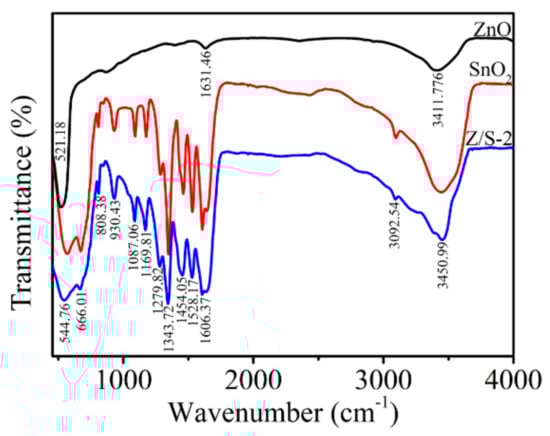 FTIR spectra of SnO2, ZnO, and Z/S-2 composite.