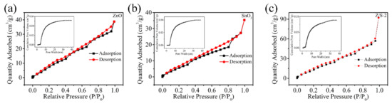 N2 adsorption-desorption isotherms and pore diameter distribution of the (a) ZnO, (b) SnO2, and (c) Z/S-2 composite.