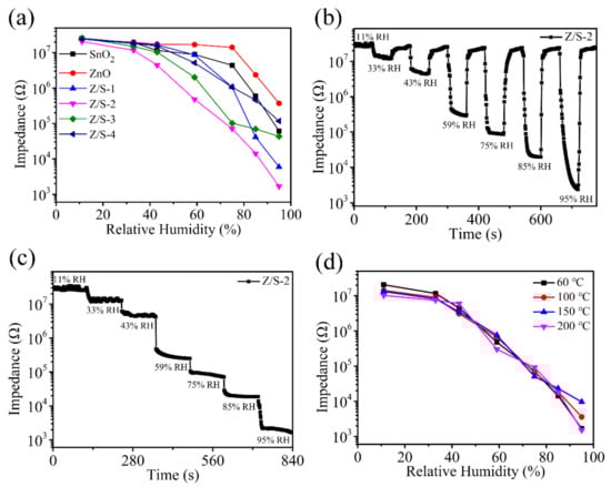 (a) Impedance changes of humidity sensors at 100 Hz, (b) response and recovery characteristics of Z/S-2 humidity sensor at different RHs, (c) impedance curve of Z/S-2 humidity sensor at different RHs, and (d) impedance response curves of Z/S-2 humidity sensor at drying temperatures of 60, 100, 150, and 200 °C.