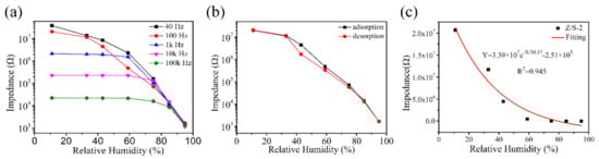 Figure 10a shows the relationship between impedance and RH for the Z/S-2 humidity sensor while operating at different frequencies (40, 100, 1k, 10k, and 100k Hz). When the operating frequency was 1k, 10k, and 100k Hz, the change in impedance was not significant at low RH levels. This is because the water molecules absorbed by the Z/S-2 humidity sensor could not be easily polarized in a high-frequency electric field [1,12]. The Z/S-2 humidity sensor exhibited a suitable response at operating frequencies of 40 Hz and 100 Hz; however, at 40 Hz, the linearity was found to be poor, and the impedance change was unstable. Thus, the best operating frequency for the Z/S-2 humidity sensor is 100 Hz. Figure 10b shows the adsorption and desorption results for the Z/S-2 humidity sensor under the conditions of different RH levels. When the RH level is the same, the maximum difference in impedance during adsorption and desorption can be defined as hysteresis [37]. Hysteresis error can be determined by solving , where is the maximum impedance difference between adsorption and desorption processes, and is the full-scale output value [23]. In the case of the Z/S-2 humidity sensor, the maximum hysteresis was determined to occur at 43% RH, and the hysteresis error was calculated to be 6.6%. The characteristic curves of the adsorption process and desorption process were observed to be very similar; thus, the Z/S-2 humidity sensor can be considered to have suitable reversibility. Figure 10c shows the response function of the Z/S-2 humidity sensor when it is operated at 100 Hz. This function can be described as , where X is the RH and Y is the impedance value. The regression coefficient was calculated to be , which confirms that the Z/S-2 humidity sensor exhibited suitable linearity.