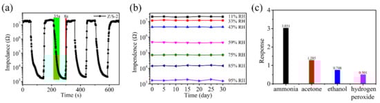 (a) Response/recovery characteristic curve of the Z/S-2 humidity sensor, (b) long-term stability under different relative humidity levels of the Z/S-2 humidity sensor and (c) responses of the Z/S-2 humidity sensor to ammonia (NH3), acetone (C3H6O), hydrogen peroxide (H2O2) and ethanol (C₂H6O).