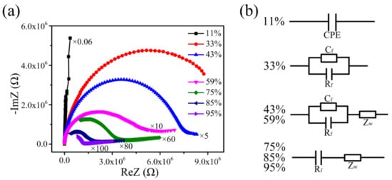 Figure 12 shows the CIS and equivalent circuit (EC) of the Z/S-2 humidity sensor under the conditions of different RH levels; these results can explain the sensing mechanism of the Z/S-2 humidity sensor. The CIS of the Z/S-2 humidity sensor was measured over the operating frequency range of 40 to 100k Hz. At 11% RH, the CIS was a long straight line, and the corresponding EC was determined to be composed of a constant phase element (CPE), indicating that only a small amount of water was adsorbed to form a chemisorbed water layer [42]. It is generally difficult for ions in the chemisorbed water layer to transfer. This phenomenon results in the generation of an abnormally high impedance value, which causes the intrinsic impedance graph to become a straight line [43,44]. As can be seen in Figure 12a, the CIS curve obtained under the condition of 33% RH was bent downward, gradually forming a semicircle. The corresponding EC is known to consist of a parallel capacitor (Cf) and resistor (Rf) [43,44]. Under these conditions, a small amount of water molecules is adsorbed onto the surface via both physical and chemical adsorption. Physically adsorbed water molecules are bonded with hydrogen bonds, which makes it difficult for water molecules to move freely, and the movement of electric charges is restricted. In this process, the strong electrostatic field around the oxygen vacancies results in the water molecules becoming adsorbed onto the sensitive material to be ionized, and H+ jumps between adjacent water molecules to conduct electricity [42]. As can be seen in Figure 12a, the CIS curves obtained under the conditions of 43% and 59% RH had the appearance of a short line that appears at the end of the semicircle in the low-frequency region. The short line represents the Warburg impedance (ZW), and the corresponding EC is the original circuit is in series with ZW [45]. As the RH was increased, a physical adsorption layer began to form on the chemical adsorption layer, and water molecules were increasingly decomposed into H3O+ and OH-. H3O+ then becomes the main carrier, and it can move freely in the physical adsorption layer. A Grotthuss (H2O + H3O+ = H3O+ + H2O) chain reaction is formed during this process [42]. Increasing the RH from 75% to 85%, followed by a subsequent increase to 95%, was found to result in the gradual disappearance of the observed semicircle in the high-frequency area. Additionally, the curve tail was found to become longer and more prominent in the low-frequency area. In the corresponding EC, the resistor (Rf) is in series with ZW, where ZW was determined to occupy a dominant position [43,44]. At this point, the surface of the Z/S-2 humidity sensor adsorbs a large amount of moisture, and the Grotthuss chain reaction is accelerated, thereby causing the impedance to rapidly decrease. This consequently enhances the humidity-sensing performance of the sensor.