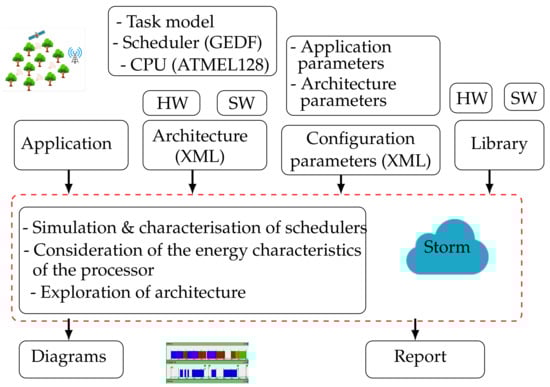 This model is built on low-power typical processor characteristics such as frequency, voltage, and timing constraints. The backend design of HEEPS model is illustrated in Figure 4. Through the hardware (resources) and software architecture (tasks) and the scheduler, the STORM simulator can allocate and schedule the tasks according to GEDF [16]. Overheads and delays are supported by the scheduler as well. The XML file is loaded with the inputs before the simulation. The results are displayed as Gantt charts or as PDF reports to debug the model and show the behavior of the network. HEEPS is used as an interlayer in-between the application level and the hardware resources for energy manager portability.