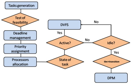 DVFS alone is not the best strategy to apply to modern processors, but it could be used with other energy management techniques. The DPM algorithm may malfunction if it is usually longer than the idle time available. Therefore, in our mixed approach, we have taken these two considerations into account. The techniques of [34,37] target to prolong the execution time as much as possible. As illustrated in [37], structuring energy management techniques exclusively on two frequencies of voltage/frequency leads to difficult design errors. They cause an imbalance in the energy manager’s decisions and the real execution states. This problem was overcome with HEEPS by taking into account discrete frequencies and voltage.