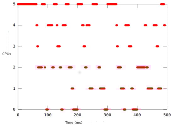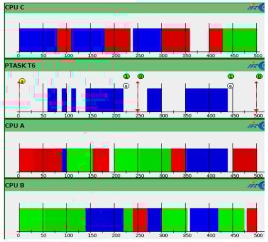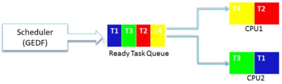 Figure 7 shows the Gantt diagrams of the execution of the different tasks. To validate the results of HEEPS and the GEDF scheduler, we check the time parameters through the STORM simulator. Time is displayed in units of 50 ms (X-axis). Each task is represented by a different color. They are activated simultaneously at . Tasks are migrated between the different queues of the ready tasks in order to have always m CPU and the m earliest task deadlines ready to be executed on these m processors.