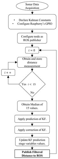 The ultrasonic sensor or sonar is one of the most common inexpensive types of sensors for mobile robots. Its principle of operation relies on the speed of the sound wave. This type of sensor suffers from high dispersion values between measurements. A preprocessing stage with both a median and a Kalman filter are applied to the ultrasonic sensor measurements. The median filter removes sudden spikes in measurement values without upsetting the Kalman Filter stabilization stage []. Abundant Kalman Filter implementations for sensing devices are presented by [,,] which present a reference guide as to the numeric constant variables required to initialize the filter. However, these values need to be manually adjusted to achieve the desired behavior of the filter. The data acquisition strategy and workflow are presented in Figure 1. From Figure 1 we can conclude that a total of 15 measurements are taken before applying the median filter or the Kalman Filter, thus improving measurement accuracy.