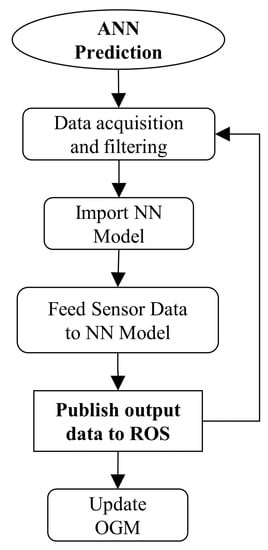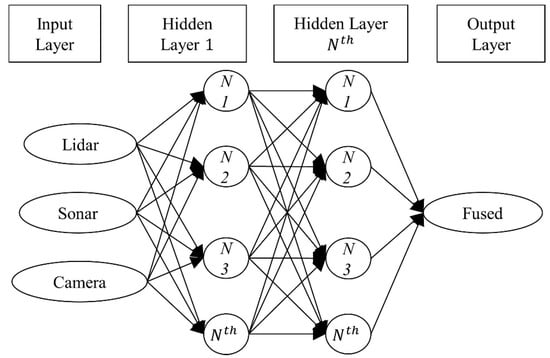 The estimation section of the data fusion strategy is conducted using an ANN algorithm with one input per sensor, multiple hidden layers, and an output neuron with the “determined distance” to each direction as shown in Figure 4. The NN was trained using an ADAM optimization algorithm and the activation function of choice for each layer is ReLu. The performance of the NN is measured using the RMSE value.