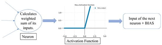 Since ANNs are based on the biological structure of neurons in the brain, computations can be parallelized by adding hidden layers and being able to comprehend multiple complex structures. Each neuron represents a computational node, which activates when the input is strong enough and crosses a defined threshold []. The mathematical expression that handles the activation of the neuron is called the Activation Function. There are multiple activation functions widely used for linear and non-linear datasets. The type of function to use is highly dependent on the data structure of the specific application since the mathematical behavior of the function is different in each case scenario. ReLu activation function in Equation (15). If the input is positive, the output will be the input. If the input is negative, the output will be zero.