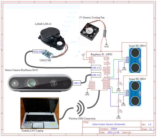 Sensor data fusion is a crucial task to process information from a multiple sensor set up in a mobile robot []. Multiple distance measurement devices with different sensing technologies (2D Laser Imaging Detection and Ranging (LiDAR), Stereo Camera, and Ultrasonic Sensors) in the same robotic platform allow the detection of a wider range of obstacle types. However, this approach requires a computationally expensive (for a mobile robot central processing unit (CPU)) data fusion algorithm to merge the distance readings from all sensors into a single reliable and accurate distance to obstacle measurement.
