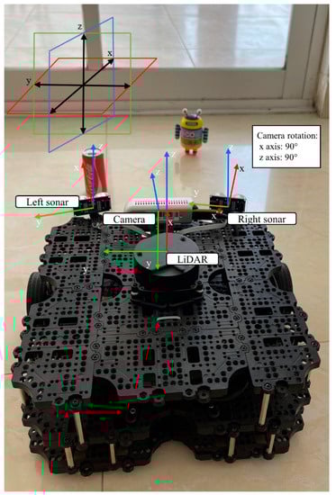 The data fusion most accepted definition is the Joint Directors Laboratory, which states that data fusion is a “multi-level process dealing with the association, correlation, combination of data and information from single and multiple sources to achieve refined position, identify estimates and complete and timely assessments of situations, threats and their significance” []. From this general definition, we can conclude that data fusion is a combination of data from single or multiple sources to obtain financially less expensive, higher quality, and more relevant information []. Even though a multiple sensors setup may indicate a higher cost compared to a single sensor setup, a 3D LIDAR can cost more than two times the combined cost of a 2D LIDAR, a digital camera, and an ultrasonic sensor altogether. Also, each sensor works using a specific working principle to detect certain materials in each environment. LiDARs are known to have difficulties locating glass and other surfaces in general where the light beam of the LiDAR refracts and does not return to the light emitter. This issue is corrected by adding ultrasonic sensors which can detect glass and refractive surfaces. However, the sonar does not have the angular resolution nor a good enough FoV to detect other obstacles that may be closer to the robot. So, we intend to exploit the best features of a specific sensor and use them to compensate for the drawbacks of the other sensor.