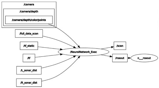 The /camera/depth/color/points topic provides raw depth-colored information from the Stereo Camera. /full_data_scan stores unprocessed laserscan data type from the LiDAR. /tf_static and /tf calculate the homogeneous transformation matrices between each sensor and the physical body of the robot. /L_sonar dist and /R_sonar_dist have the left and right Kalman filtered sonar distance measurement respectively. /Neural Network_Exec is the node in charge of receiving all the sensors output, formatting the distance points from the camera, and feed them all through the neural network. The output distance is published in the original /scan topic used by most OGM generator algorithms.