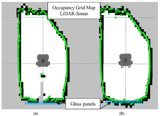 Occupancy grid maps showing the: (a) Ground truth (reference map); (b) LiDAR-Sonar fusion generated map with glass panel.