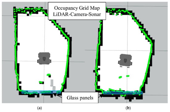 Occupancy grid maps showing the: (a) Ground truth (reference map); (b) LiDAR-Camara-Sonar fusion generated map with glass as main obstacle.