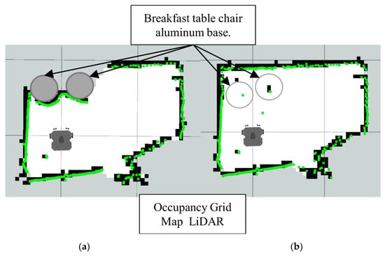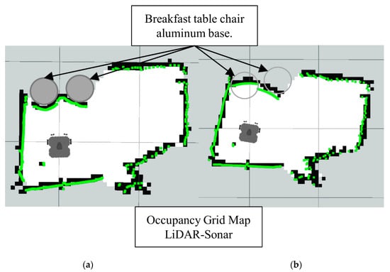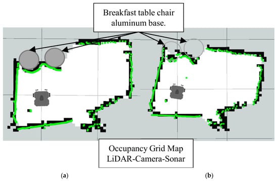 Note how in Figure 19 the LiDAR alone cannot detect the full area of the breakfast table chair base. Meanwhile, in the Figure 20 the Lidar-Sonar fusion strategy shows this approach can effectively detect the obstacles, but it is not very accurate with the rounded sections of the obstacle.