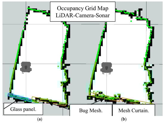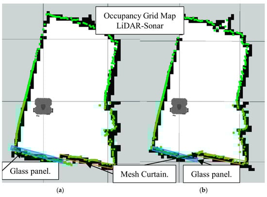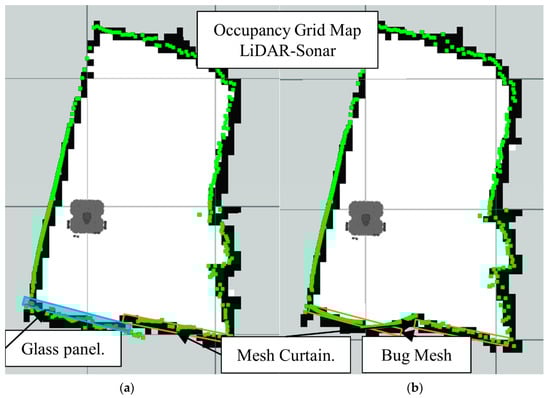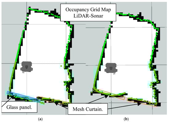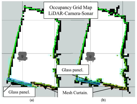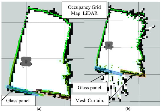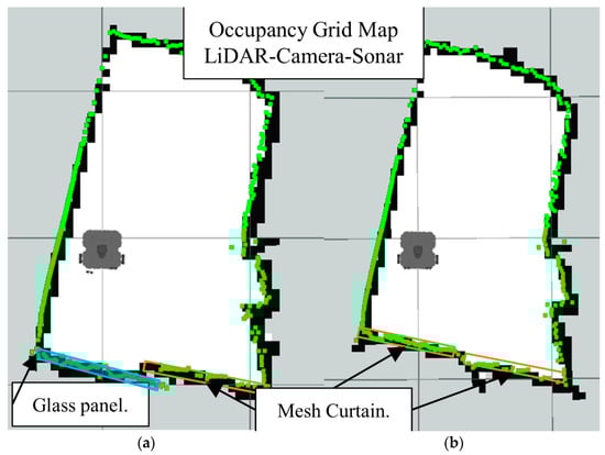 Occupancy grid maps showing the: (a) Ground truth (reference map); (b) LiDAR-Sonar fusion generated map with insect door mesh in front of the glass.