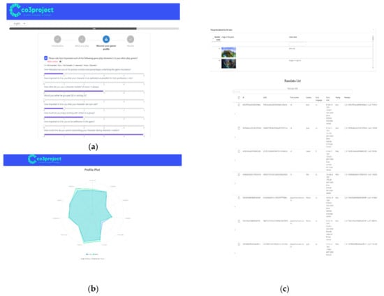 Screenshots of the web interface created for data collection. (a) shows a portion of the questions with the sliding selector, from 1 to 5. (b) shows the user’s profile in relation to the gamification elements. (c) shows the source data stored in a database.