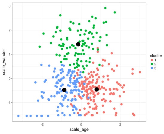 Result from clustering algorithm for three clusters indicated in three colors (red, green, blue). The centroids for each cluster are indicated with a black dot.
