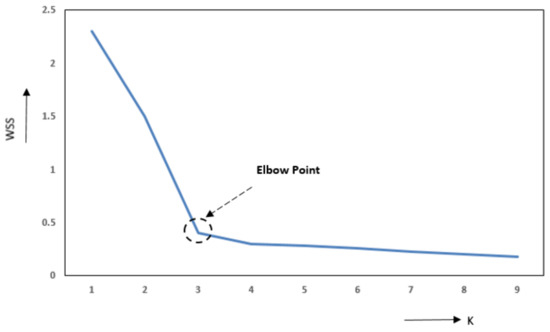 The evolution of the WSS vs. the number of clusters (K), indicating with an arrow the optimal point of change (Elbow Point) in the value of K = 3.